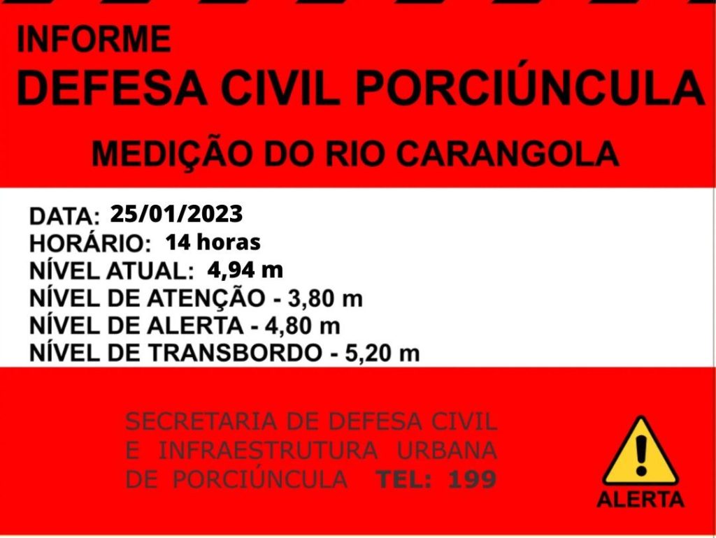 Diante do nível atual do Rio Carangola, que teve um aumento considerável em seu leito nos últimos dias, a Prefeitura de Porciúncula alerta a população para a possibilidade de alagamentos e inundações. A Defesa Civil de Porciúncula informa que está fazendo um monitoramento constante do rio, e comunica sobre a possibilidade de continuidade das chuvas nos próximos dias, com possíveis quedas de barreiras em estradas e áreas de risco.