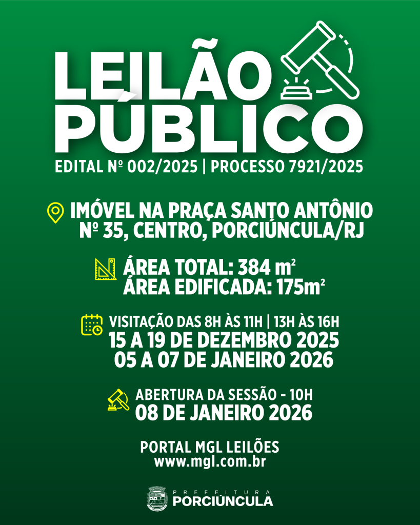 A Prefeitura de Porciúncula, através da Secretaria Municipal de Administração, realiza o Leilão Público de um imóvel pertencente ao patrimônio municipal, conforme Edital de Leilão Nº 002/2025 – Processo 7921/2025. O certame será totalmente on-line, conduzido pelo leiloeiro oficial Fernando Caetano Moreira Filho, e ocorrerá no dia 08 de janeiro de 2026, a partir das 10h, pelo portal MGL Leilões .