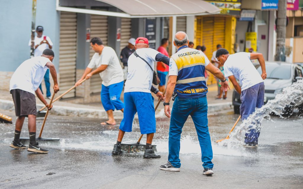 Uma equipe executou o serviço de varrição e limpeza com a ajuda de um caminhão-pipa em toda a extensão da Avenida do Comércio, retirando também resíduos da feira para garantir um ambiente limpo e agradável a comunidade local.