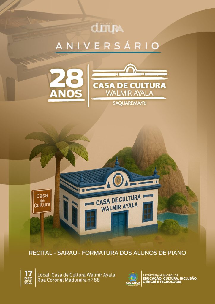 A Prefeitura de Saquarema, por meio da Secretaria Municipal de Educação, Cultura, Inclusão, Ciência e Tecnologia, está se preparando para celebrar os 28 anos da Casa de Cultura Walmir Ayala, um dos espaços culturais mais importantes e tradicionais do município. Para marcar esta data especial, será realizada uma programação comemorativa com recital, sarau e a formatura dos alunos de piano, destacando o talento e a dedicação dos estudantes que se desenvolvem artisticamente no local.