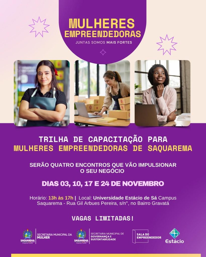 A Prefeitura de Saquarema, por meio da Secretaria da Mulher, da Sala do Empreendedor e em parceria com a Estácio de Sá, está convidando as mulheres do município a participarem da Trilha de Capacitação em Empreendedorismo Feminino.