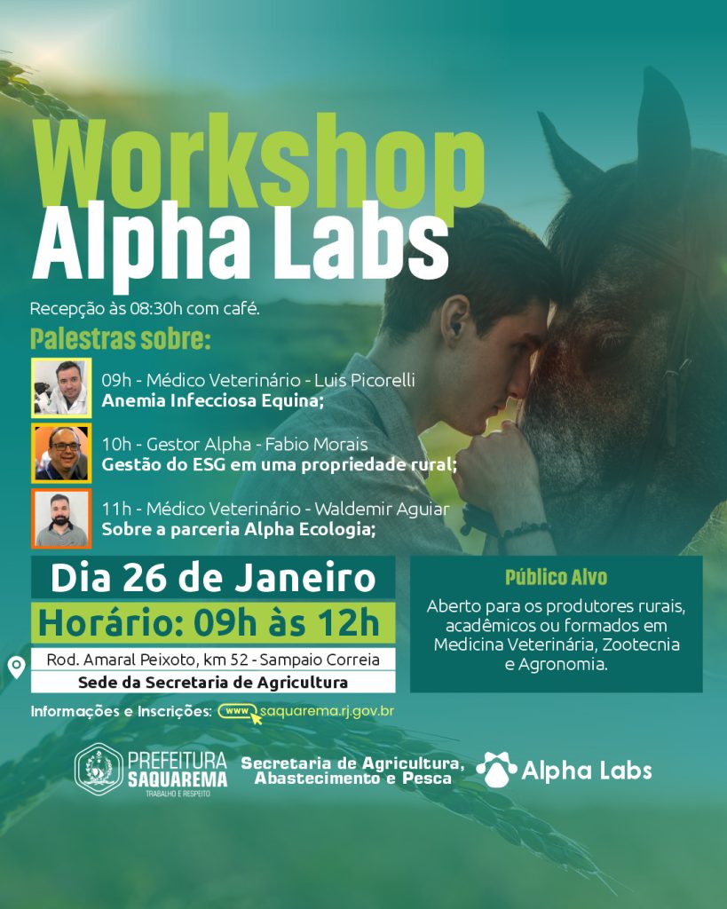 No próximo dia 26 de janeiro, a Prefeitura de Saquarema, por meio da Secretaria Municipal de Agricultura, Abastecimento e Pesca, promoverá o Workshop Alpha Labs, um evento voltado para Produtores rurais, Acadêmicos e Profissionais formados em Medicina Veterinária, Zootecnia e Agronomia, que buscam conhecimento e soluções sustentáveis para o setor agropecuário