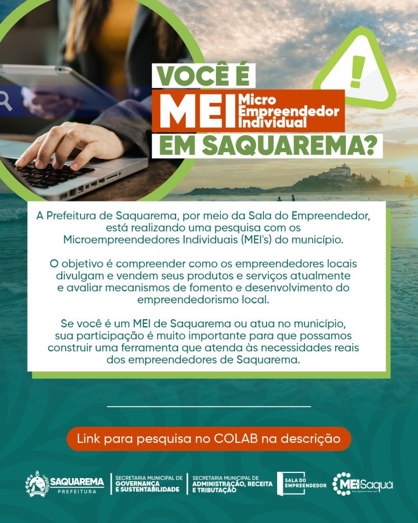 A Prefeitura de Saquarema, por meio da Sala do Empreendedor e da Secretaria Municipal de Governança e Sustentabilidade, está realizando uma pesquisa inédita voltada aos Microempreendedores Individuais (MEIs) do município. O objetivo é compreender de que forma os empreendedores locais divulgam e comercializam seus produtos e serviços, além de identificar demandas, desafios e oportunidades para o fortalecimento do setor.