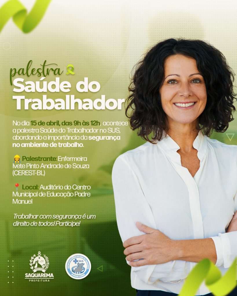 A Prefeitura de Saquarema, por meio da Secretaria Municipal de Saúde e em parceria com o Centro de Referência em Saúde do Trabalhador da Baixada Litorânea, realizará uma palestra sobre o tema “Saúde do Trabalhador”. O evento ocorrerá no dia 15 de abril (terça-feira), das 09 às 12 horas, no auditório do Centro Municipal de Educação Padre Manuel, no bairro Porto da Roça.