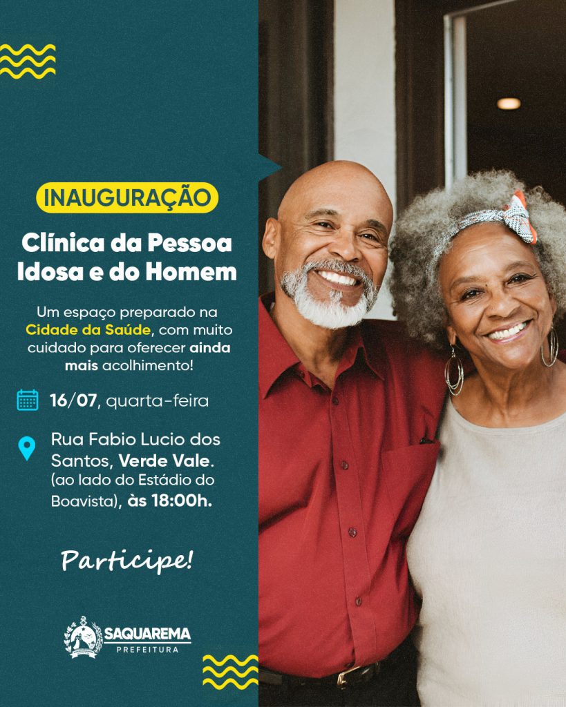 Na próxima quarta-feira, dia 16 de julho, às 18h, a Prefeitura de Saquarema, por meio da Secretaria Municipal de Saúde, realizará a inauguração da Clínica da Pessoa Idosa e do Homem, um importante avanço no atendimento especializado para parte significativa da população.