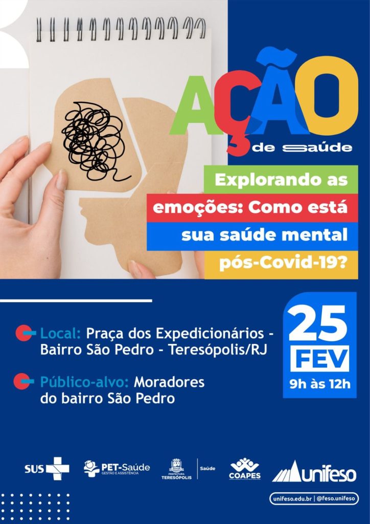 Neste sábado (25), a Secretaria Municipal de Saúde de Teresópolis participará da ação “Explorando as emoções: como está sua saúde mental pós-Covid-19?”, em parceria com o Unifeso (Centro Universitário Serra dos Órgãos), das 9h às 12h, no bairro de São Pedro.