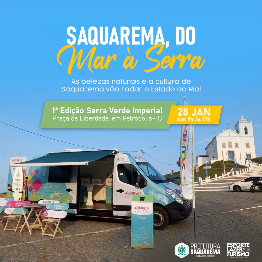 As belezas naturais e a cultura de Saquarema vão rodar o Estado do Rio! Isso mesmo! A Prefeitura de Saquarema, por meio da Secretaria Municipal de Esporte, Lazer e Turismo, vai iniciar o projeto “Saquarema do Mar à Serra”, com o objetivo de divulgar a cidade de Saquarema como destino turístico nas cidades serranas do nosso estado, além de municípios próximos à divisa do Rio com Minas Gerais, São Paulo e Espírito Santo!