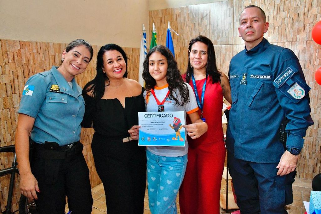 Representando a secretária municipal de Educação, Sheila Boechat, a secretária municipal Especial de Educação, Luane Alves, parabenizou a Polícia Militar, os alunos e a todos envolvidos no projeto. “A parceria é importante e o prefeito Mário Canella é um defensor da Segurança Pública”, arrematou Luane, ao lado da secretária especial de ensino, Fernanda Romero, e da diretora do Fundamental I, Valéria Constâncio.