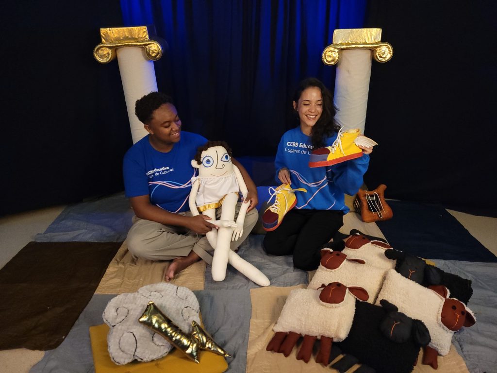 Aventura de Hermes – mediação acessível que transforma o espaço do educativo em uma cena viva e sensorial. A atividade foi especialmente pensada para atender diferentes formas de percepção e mobilidade, utilizando recursos táteis e visuais para narrar a história do deus Hermes — desde a artimanha com as ovelhas de Apolo até a criação e entrega da lira. Durante o percurso, colunas evocam a arquitetura do CCBB, enquanto objetos com diferentes texturas formam os caminhos percorridos. Hermes surge com suas sandálias aladas, e Zeus aparece entre trovões e nuvens. O público é convidado a cuidar das ovelhas e caminhar com os educadores pelos passos de Hermes até o fim da história, numa experiência coletiva e inclusiva. Agendamento antecipado via e-mail: