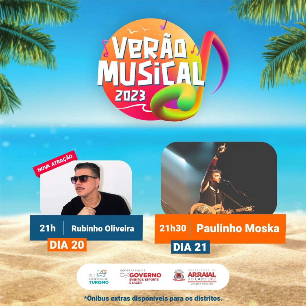 No sábado (21), Paulinho Moska fecha a segunda semana do evento em grande estilo. O cantor e compositor sobe ao palco às 21h30, tocando seus maiores sucessos.É a sua chance de cantar “Pensando em você” para aquela pessoa especial, em uma noite típica de verão em Arraial do Cabo. Siga as redes sociais oficiais da Prefeitura e fique por dentro da programação.