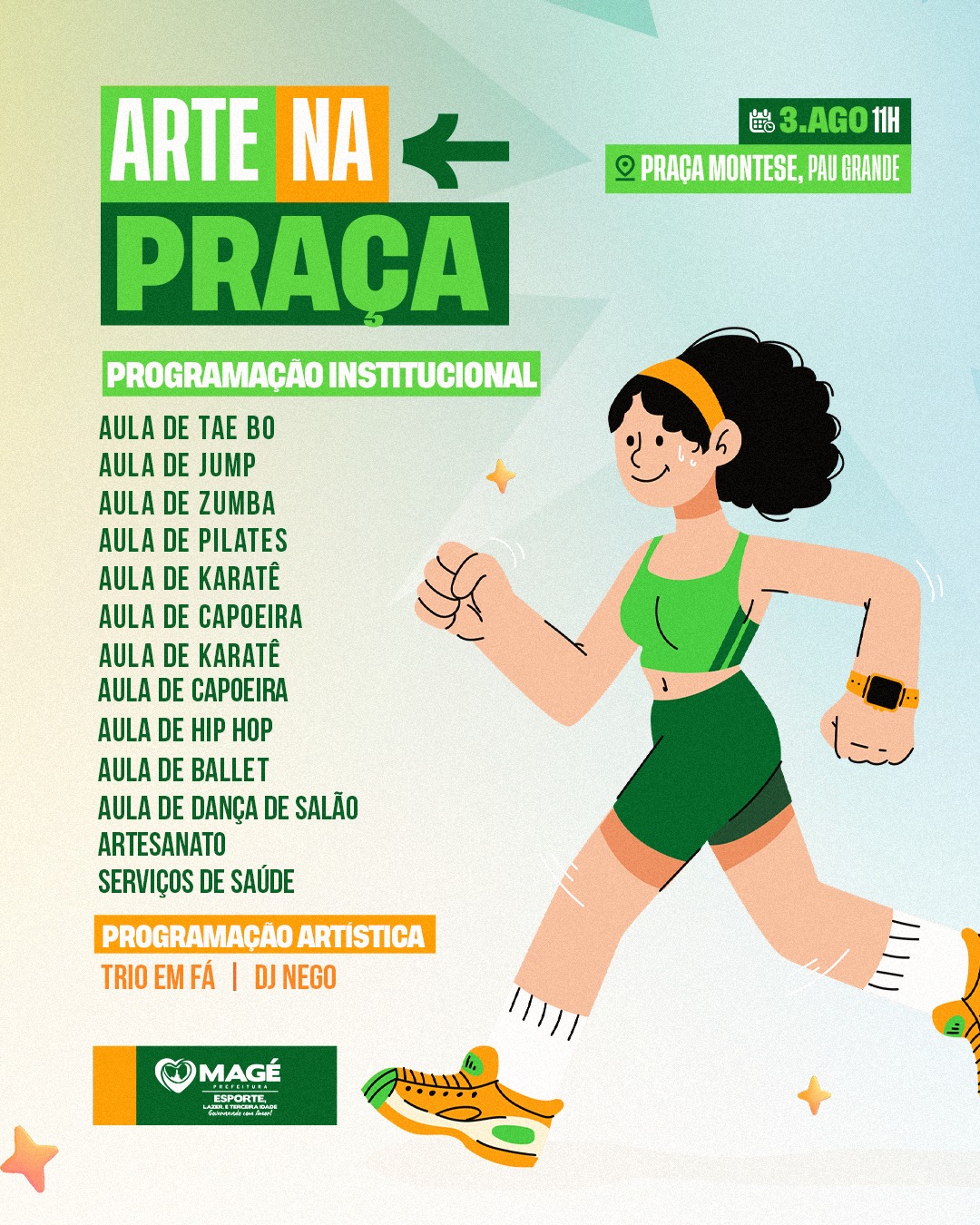 No próximo domingo, dia 3 de agosto, a Praça Montese, no distrito de Pau Grande, será palco de mais uma edição do projeto Arte na Praça, que promete reunir famílias mageenses em um dia repleto de cultura, lazer e cidadania. A programação tem início às 11h, com diversas atividades gratuitas para todas as idades.