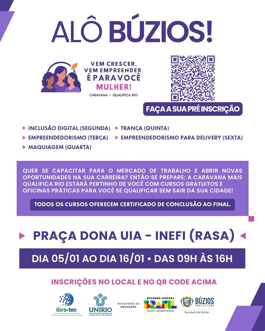 A Prefeitura de Búzios, por meio da Secretaria da Mulher, recebe a partir do dia 5 de janeiro o Projeto Caravana + Qualifica Rio, que oferecerá cursos gratuitos de qualificação profissional na Praça Tia Uia, no bairro da Rasa, até o dia 16 de janeiro.