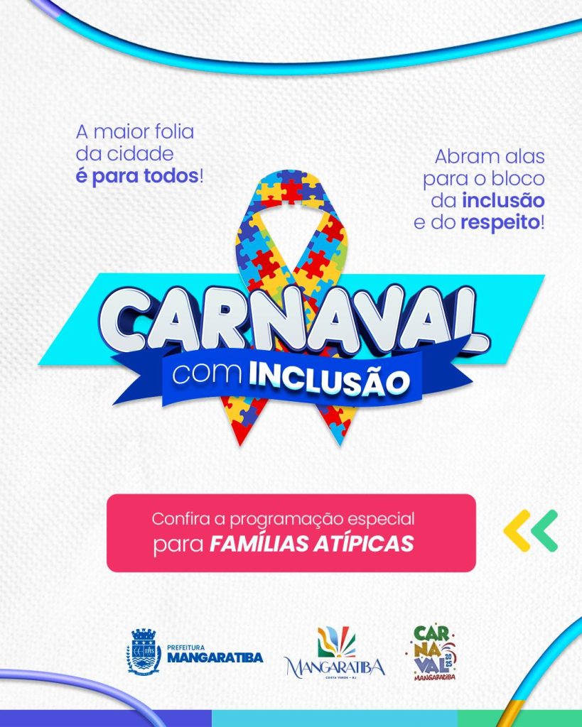 Carnaval completo é o carnaval para todos. E pensando nisso, por determinação do Prefeito Luiz Cláudio Ribeiro, a Prefeitura de Mangaratiba vai realizar de 01 a 04 de março o projeto inédito ‘Carnaval com Inclusão’. A iniciativa visa promover oficinas e acolhimento inclusivo para famílias atípicas durante os dias de folia.