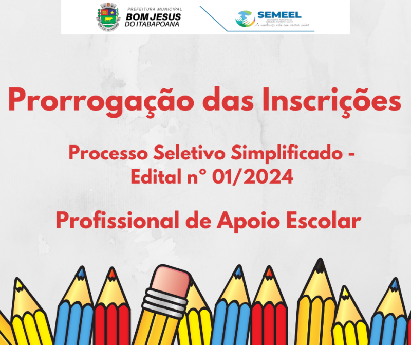 A Prefeitura de Bom Jesus do Itabapoana, por meio da Secretaria Municipal de Educação, Esporte e Lazer informa que fica prorrogado o prazo de inscrições do Processo Seletivo Público Simplificado, destinado à seleção e contratação de profissionais de Apoio Escolar da Educação Básica para atendimento ao aluno público-alvo da Educação Especial, que objetiva a contratação imediata, por tempo determinado, bem como formação de cadastro reserva, para atuação na Rede Municipal de Ensino objetivando atender à necessidade temporária de excepcional interesse público.