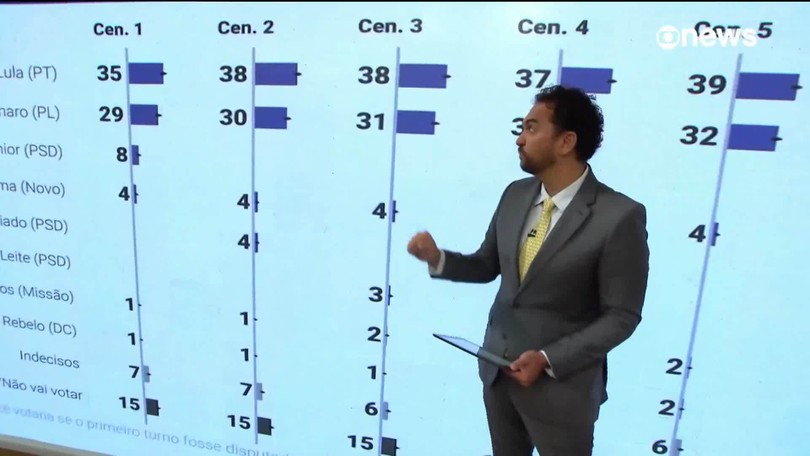 Nos cenários de 1º turno, Lula aparece à frente com percentuais que variam entre 35% e 39%. Flávio vem em segundo lugar, com índices que vão de 29% a 33%.