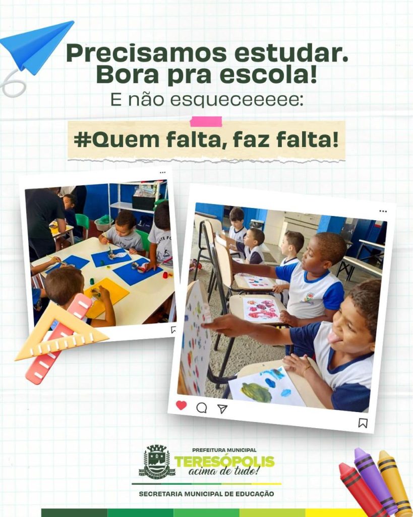 A Prefeitura de Teresópolis, por meio da Secretaria Municipal de Educação (SME), lançou a campanha ‘Quem falta, faz falta!”, com o objetivo de combater a infrequência escolar e garantir a continuidade do aprendizado dos estudantes da rede municipal. A iniciativa reforça a importância da frequência diária como parte essencial do processo de aprendizagem e do fortalecimento dos vínculos. Essa campanha tem o objetivo de alertar a todos sobre o assunto, incentivando a frequência aos bancos escolares, visando assegurar o direito de toda criança e adolescente à aprendizagem bem sucedida. A escola é mais do que um lugar para aprender, é onde a gente cresce, brinca, faz amigos e cria memórias para a vida toda!