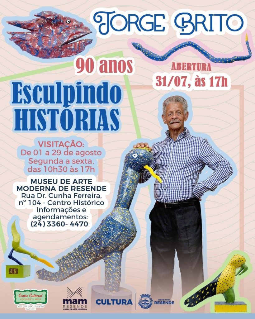 A Prefeitura de Resende, por meio da Secretaria Municipal de Cultura em parceria com o Centro Cultural Visconde de Mauá, promove, de 1º a 29 de agosto, a mostra comemorativa intitulada “Jorge Brito: 90 anos esculpindo histórias”, no Museu de Arte Moderna de Resende. A cerimônia de abertura da exposição será realizada no dia 31 de julho (quinta-feira), a partir das 17h, no MAM, com a presença do artista plástico.