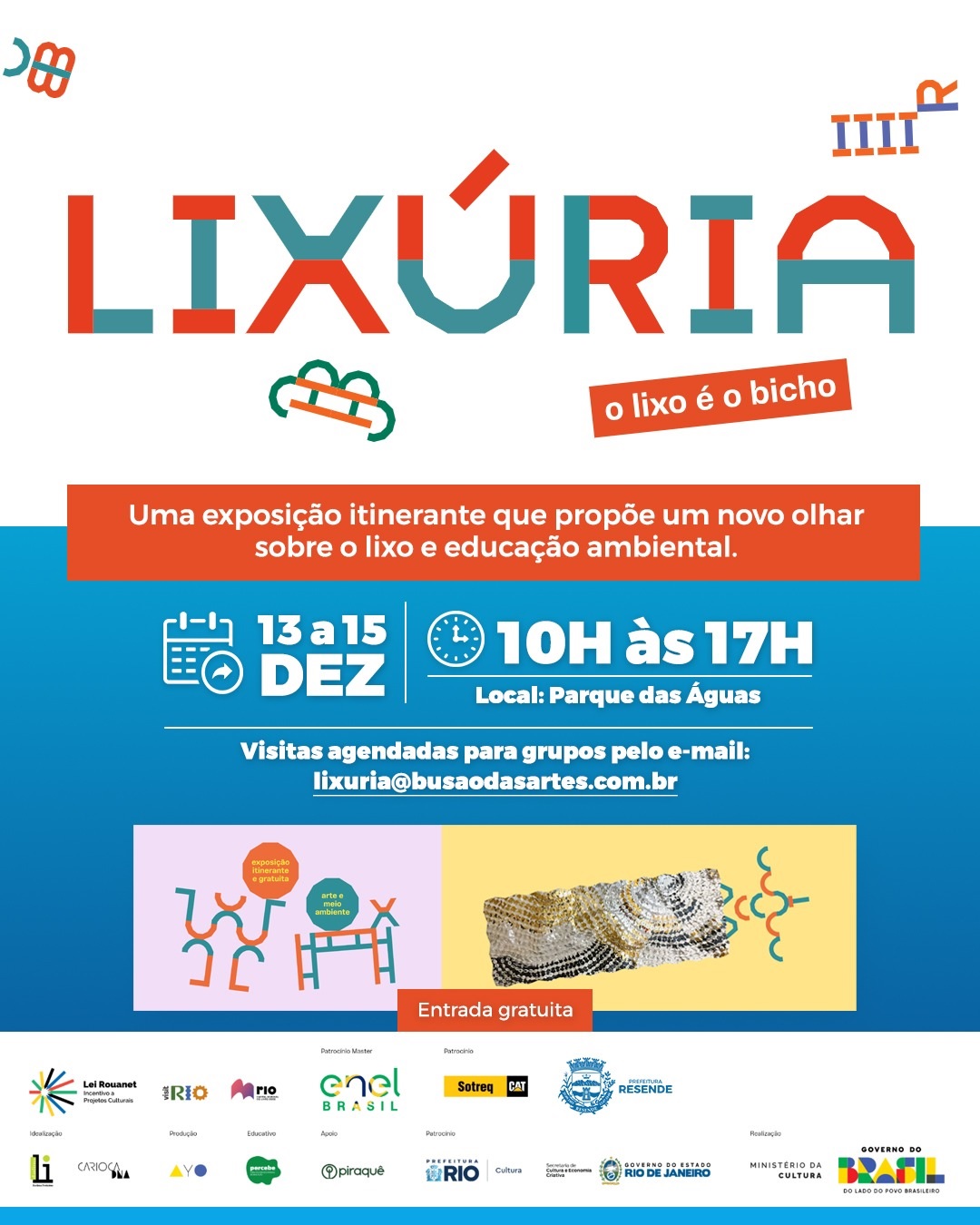 O final de semana em Resende terá uma programação especial repleta de cultura, arte e educação ambiental, com a chegada da exposição itinerante ‘Lixúria: o lixo é o bicho’. O museu sobre rodas estaciona no Parque das Águas neste sábado, dia 13 de dezembro, e fica aberto à visitação até a próxima segunda-feira, dia 15, das 10h às 17h. A mostra recebe visitas em grupo mediante agendamento pelo e-mail lixuria@busaodasartes.com.br. A entrada é gratuita.