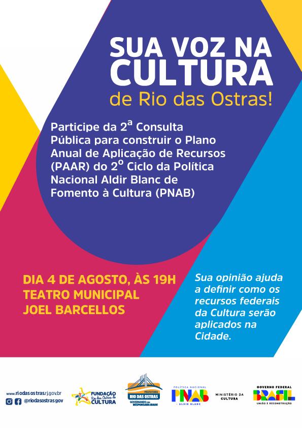 Rio das Ostras quer escutar artistas e fazedores de cultura locais para assegurar que os recursos da Política Nacional Aldir Blanc de Fomento à Cultura (PNAB) continuem a ser aplicados de forma democrática, como determina a Lei 14903/2024. Com esse objetivo, o Município promove na próxima segunda, 4 de agosto, às 19 horas, no Teatro Municipal Joel Barcellos, a Consulta Pública (Oitiva) do Plano Anual de Aplicação de Recursos (PAAR) do 2º Ciclo da PNAB.