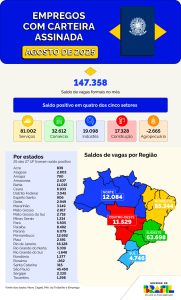 RECORTE DE AGOSTO – Levando em conta apenas o mês de agosto, 147.358 novos postos formais de trabalho foram abertos no Brasil, saldo de 2.239.895 admissões e 2.092.537 desligamentos. Foram registrados saldos positivos em 25 das 27 Unidades da Federação. Os destaques em números absolutos ficaram com São Paulo (45.450), Rio de Janeiro (16.128) e Pernambuco (12.692). Em termos relativos, Paraíba (+1,61%), Rio Grande do Norte (+0,98%) e Pernambuco (+0,82%) tiveram protagonismo.