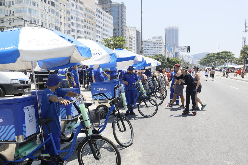 Neste sábado, mais de 10 mil litros de água gelada também foram distribuídos em Copacabana, no Leme e no Aterro do Flamengo, em meio a praias cheias e sensação térmica elevada.