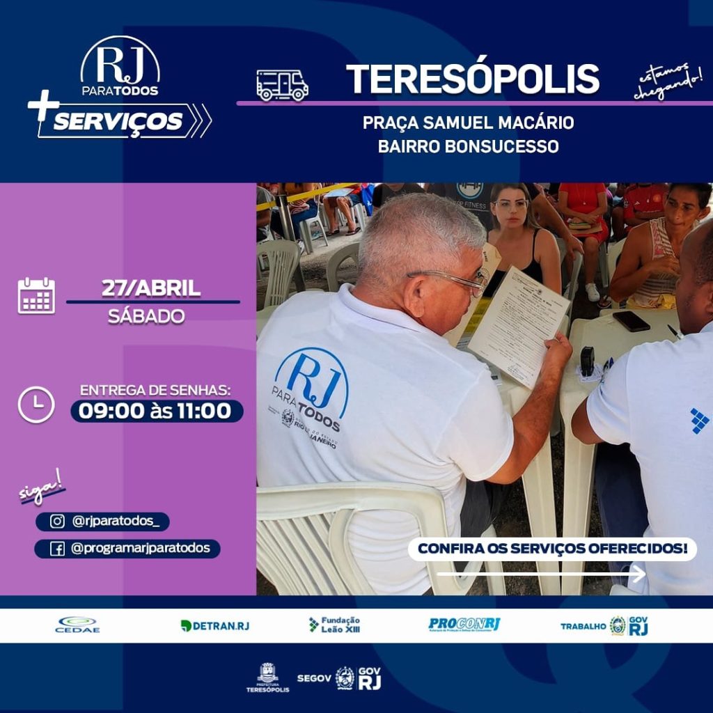 No próximo sábado, 27, Teresópolis receberá mais uma edição do programa ‘RJ para Todos’ do Governo do Estado. Dessa vez, os atendimentos serão na Praça Samuel de Paula Macário, em Bonsucesso, no 3º Distrito. Iniciativa da Secretaria de Estado de Governo em parceria com a Prefeitura de Teresópolis, por meio das Secretarias Municipais de Trabalho, Emprego e Economia Solidária e de Governo e Coordenação, a ação social acontecerá das 9h às 15h, com distribuição de senhas até às 13h.