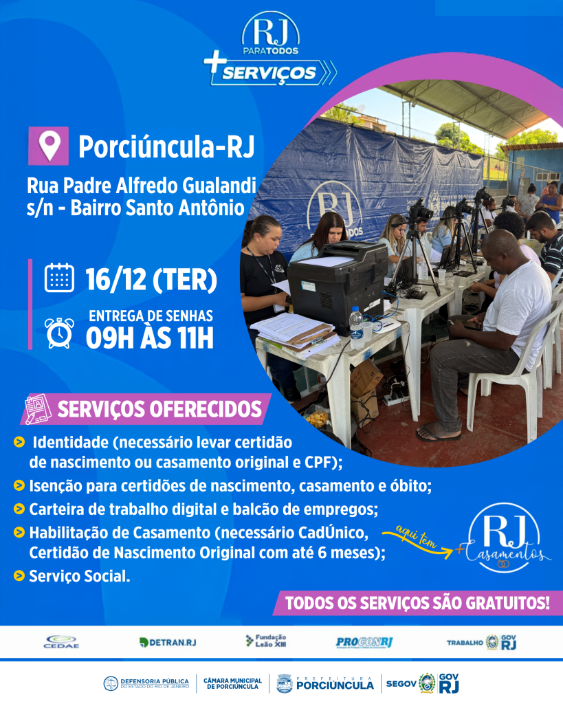 A iniciativa tem a participação da Prefeitura de Porciúncula em parceria com a Junta Militar, Câmara dos Vereadores, Fundação Leão XIII, Defensoria Pública, Cedae, Detran-RJ, Secretaria de Trabalho-RJ, Procon-RJ e Segov-RJ, reforçando a atuação integrada entre estado e município.
