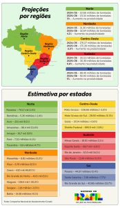 No estado, as projeções indicam forte aumento na produtividade por hectare, que passaria de 3.286 quilos por hectare para 3.500 quilos, um aumento de 6,5%. As estimativas também apontam leve aumento na área destinada à produção de grãos no Rio de Janeiro, de 2,8 mil hectares em 24/25 para 3 mil hectares em 25/26: 7,1%.