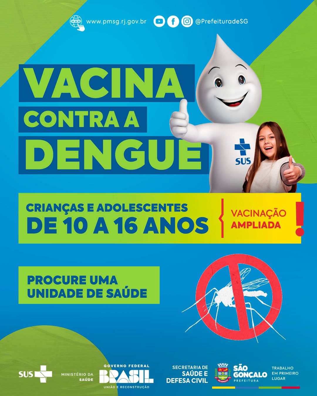 “Pedimos aos pais que levem os seus filhos para se vacinar contra a dengue. A vacinação é um ato de amor e ajuda na saúde coletiva da população. A procura está baixa e a população precisa se conscientizar de que toda vacina é importante para evitar a doença ou a forma grave dela. É um verdadeiro seguro da manutenção da saúde”, orientou a secretária municipal de Saúde e Defesa Civil de São Gonçalo, Dra. Bianca Serour.