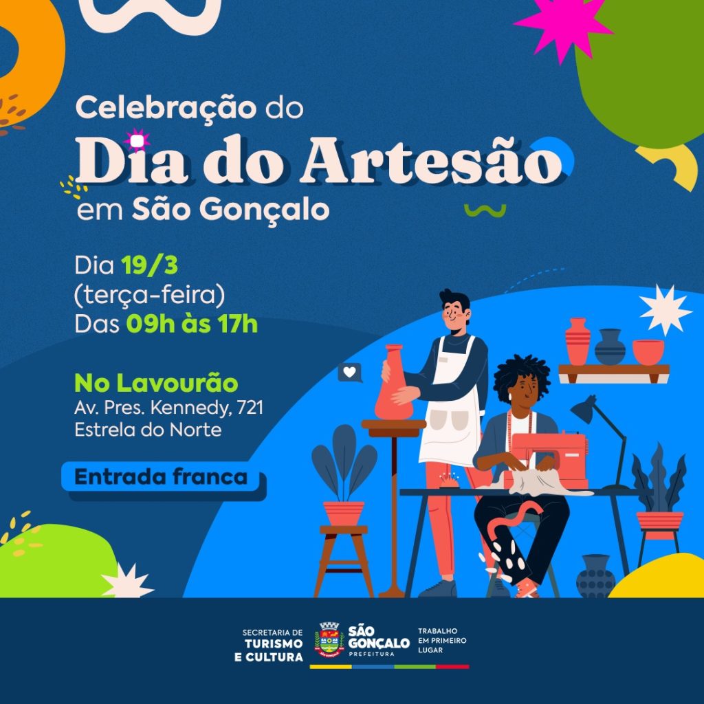 A Secretaria de Turismo e Cultura da Prefeitura de São Gonçalo promove, nesta terça-feira, dia 19 de março, uma celebração especial em homenagem ao Dia do Artesão, com uma série de atividades no Centro Cultural Joaquim Lavoura, o Lavourão, no bairro Estrela do Norte. As ações terão início às 9h e se estenderão ao longo do dia, com o objetivo de destacar o papel dos artesãos na cultura, economia e identidade local.