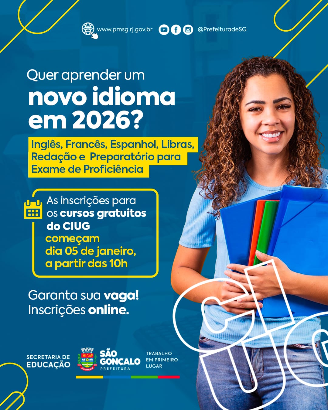 Quem deseja se matricular nos cursos gratuitos de idiomas – Inglês, Francês, Espanhol -, Preparatório de Redação, Libras e Curso Preparatório para o Exame de Proficiência em Língua Inglesa no Centro Interescolar Ulysses Guimarães (CIUG), da Prefeitura de São Gonçalo, deve ficar atento. As inscrições devem ser realizadas a partir das 10h da próxima segunda-feira, 5 de janeiro, até às 23h e 59min do dia 8 de janeiro, pela internet, no endereço eletrônico: https://ciug.saogoncalo.educacaomais.com.br/. A relação dos candidatos selecionados estará disponível no dia 13 de janeiro, no site e exposto no mural do CIUG a partir das 14h.