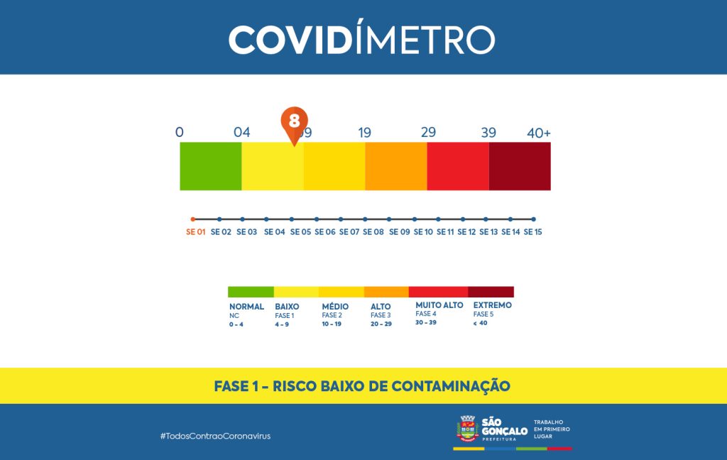 Na primeira semana de janeiro deste ano, entre os dias 1 e 7, os índices que medem a contaminação do coronavírus em São Gonçalo contabilizaram oito pontos, deixando a cidade na fase amarelo 1 do covidímetro, com baixo risco de transmissão. Na semana 01/2023, o percentual dos casos notificados nas duas últimas semanas ficou com 121% devido a atualizações na base de dados ocorridas após período de instabilidade nos sistemas de informação do Estado.