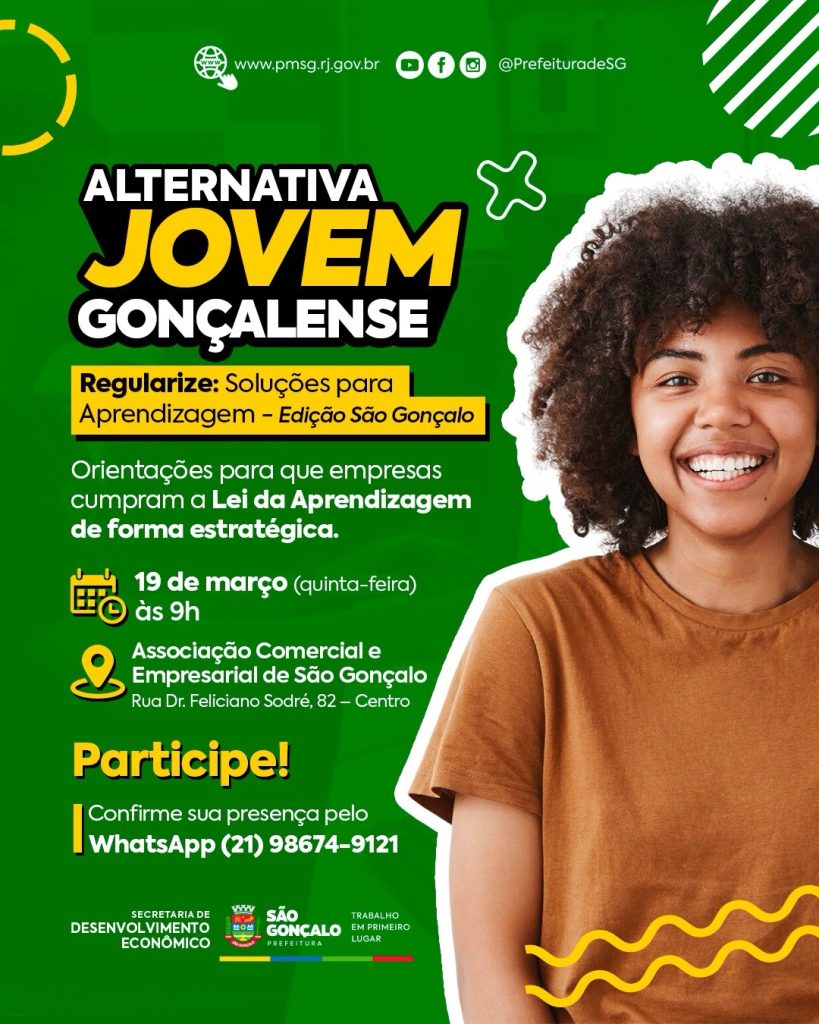 O evento tem o objetivo de esclarecer dúvidas e auxiliar empresas a entenderem e cumprirem a Lei da Aprendizagem, na qual empresas de médio e grande porte devem contratar jovens de 14 a 24 anos como aprendizes, combinando formação teórica e prática. O evento “Regularize: Soluções para Aprendizagem – Edição São Gonçalo” faz parte do lançamento do programa “Alternativa Jovem Gonçalense”, voltado para o desenvolvimento de jovens em São Gonçalo.