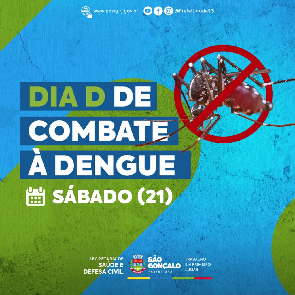 A Secretaria de Saúde e Defesa Civil da Prefeitura de São Gonçalo realiza o Dia D de Combate à Dengue neste sábado (21), das 8h às 12h, na Praça Estephânia de Carvalho, mais conhecida como Praça do Zé Garoto, e nas ruas ao redor. A ação vai contar com orientação sobre a doença, distribuição de cloro para purificação da água armazenada e vacinação contra a dengue para as crianças entre 10 e 14 anos.