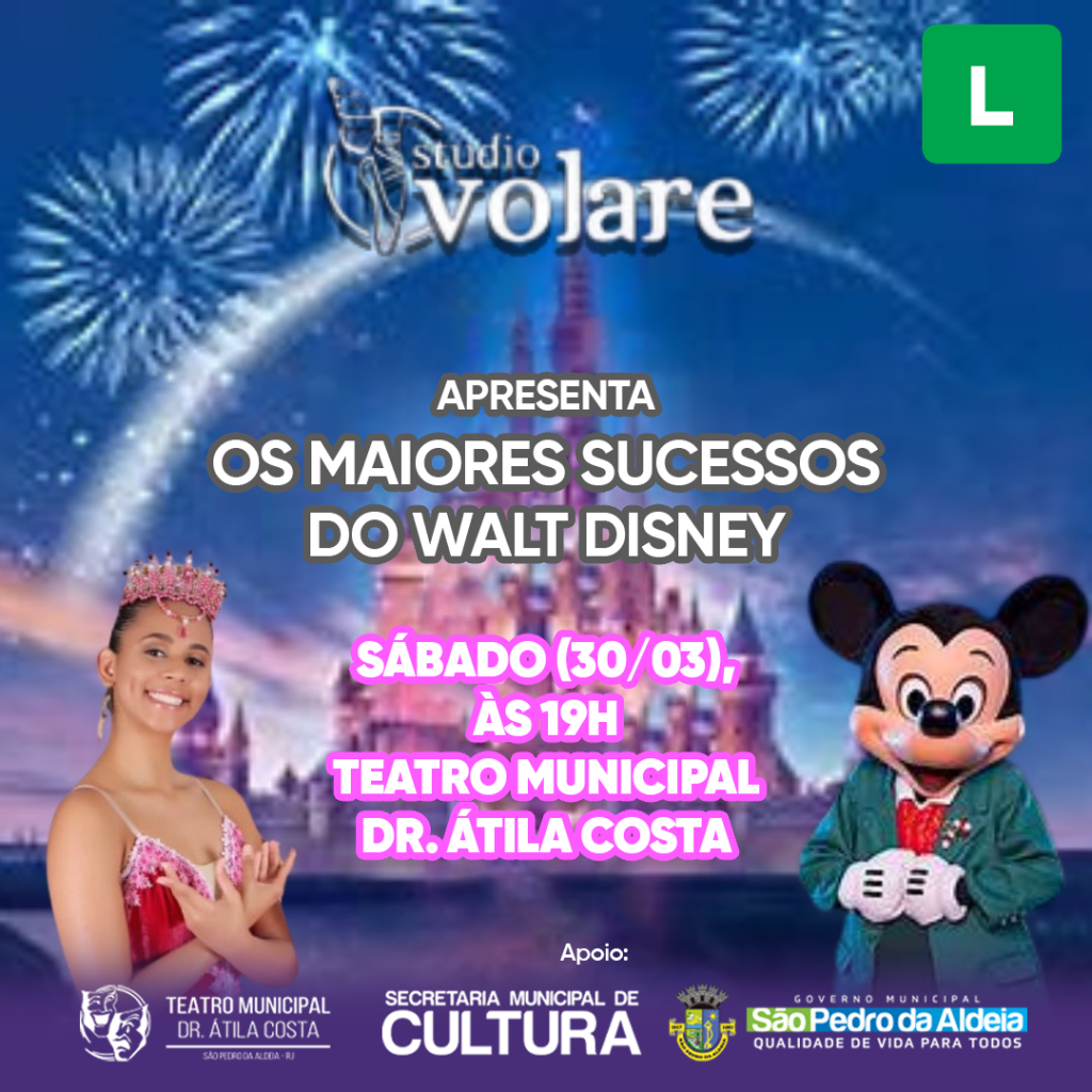 O Teatro Municipal Dr. Átila Costa recebe, neste sábado (30/03), às 19h, o espetáculo de ballet “Sucessos Walt Disney”, apresentado pelo Studio de Dança Volare. A atração reúne alguns dos personagens mais famosos das animações dos estúdios Disney, que marcaram gerações. A atração tem classificação indicativa livre e os ingressos já estão à venda. O espetáculo conta com o apoio da Prefeitura de São Pedro da Aldeia, por meio da Secretaria Municipal de Cultura.