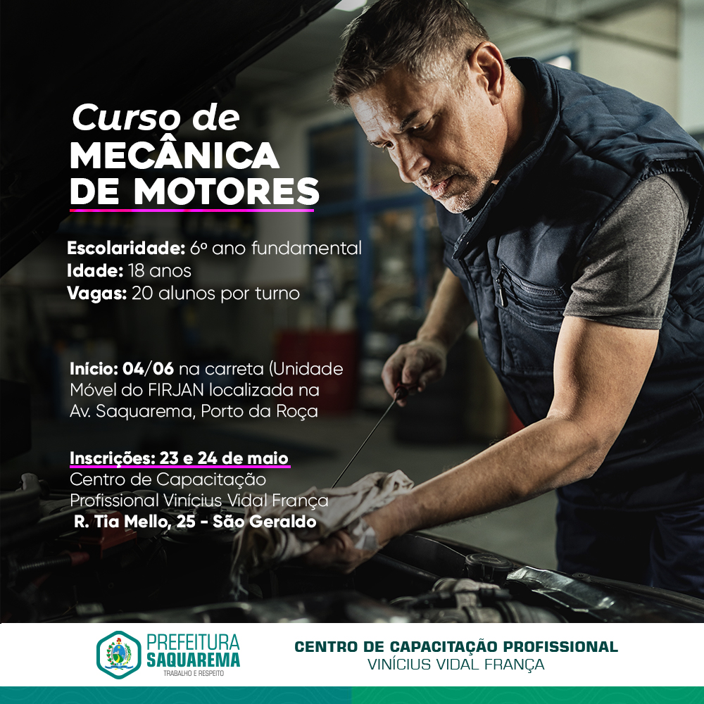 A Prefeitura de Saquarema, por meio do Centro de Capacitação Profissional Vinicius Vidal França, vai abrir inscrições para o curso de Mecânica de Motores Ciclo Otto (Automotivo), que será realizado na Unidade Móvel do SENAI e em parceria com a FIRJAN, no bairro Porto da Roça.