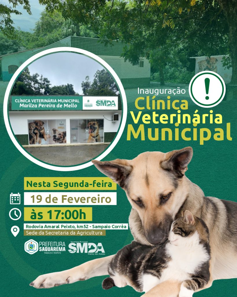 A Prefeitura de Saquarema, por meio da Secretaria Municipal dos Direitos dos Animais, convida a população para a cerimônia de inauguração das obras de reforma e ampliação da Clínica Veterinária Municipal, em Sampaio Corrêa. A nova unidade será entregue nesta segunda-feira, 19, às 17 horas.