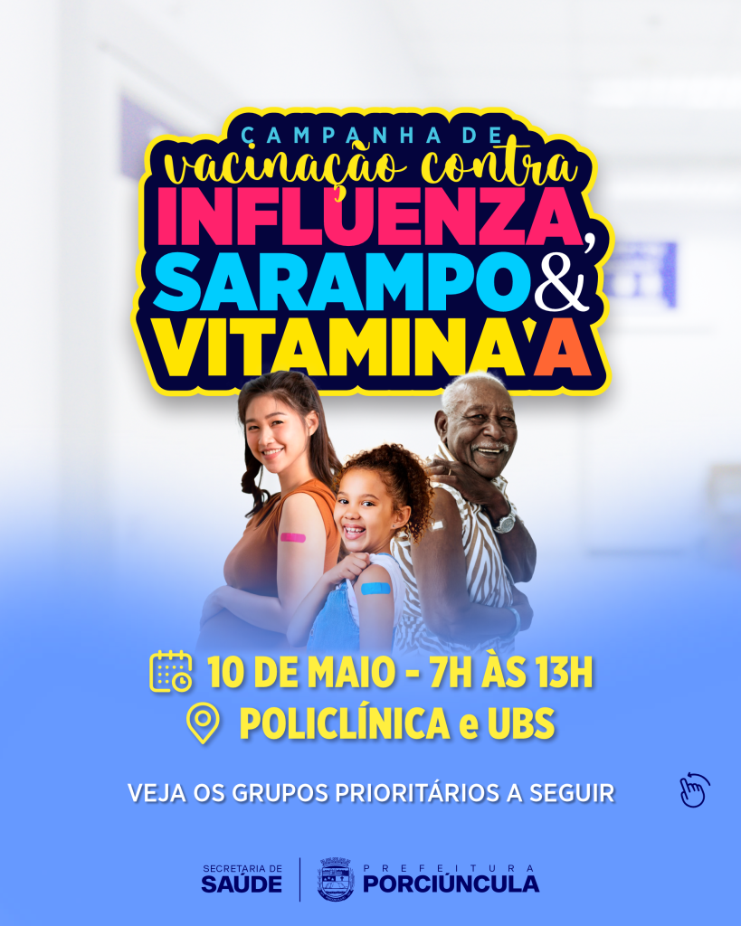 A Secretaria Municipal de Saúde volta a convocar a população para atualizar a caderneta de vacinação contra gripe para público alvo extenso, e contra sarampo para crianças e adolescentes e suplementação de vitamina A para crianças, a ser realizada no dia 10 de maio, sábado, na Policlínica Municipal e nas Unidades de Saúde (UBS) dos três distritos, de 7 às 13 horas.