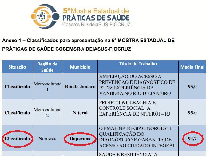 A Saúde de Itaperuna conquistou o 3º lugar na 5ª edição da Mostra Estadual de Práticas de Saúde, promovida pelo Conselho de Secretários Municipais de Saúde (Cosems RJ) em parceria com a IdeiaSUS Fiocruz. O reconhecimento veio com o projeto “O PMAE na Região Noroeste – classificação do diagnóstico e garantia de acesso ao cuidado integral”, inscrito pela equipe técnica da Secretaria Municipal de Saúde.
