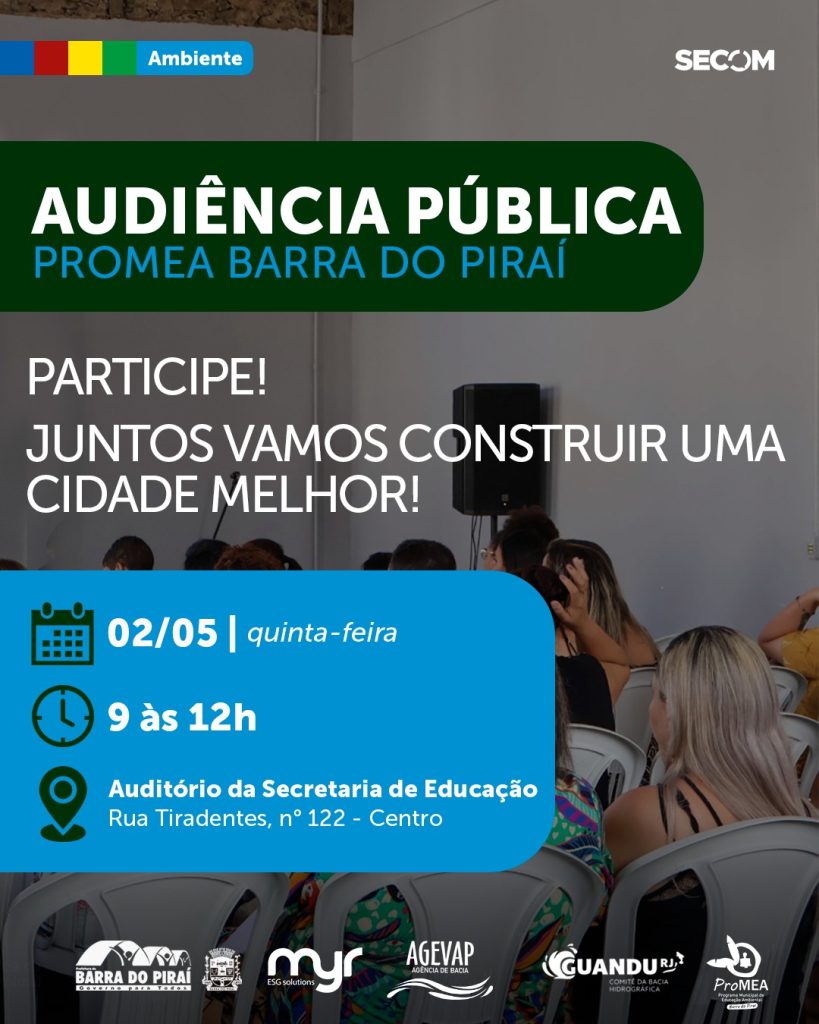 A Prefeitura Municipal de Barra do Piraí, por meio da Secretaria de Ambiente, está apoiando mais uma realização do Comitê da Bacia Hidrográfica do Guandu RJ, a audiência pública do Programa Municipal de Educação Ambiental (Promea). O evento acontece dia 02 de maio, de 9 às 12 horas, no auditório da Secretaria de Educação, localizado na rua Tiradentes, 122, Centro.