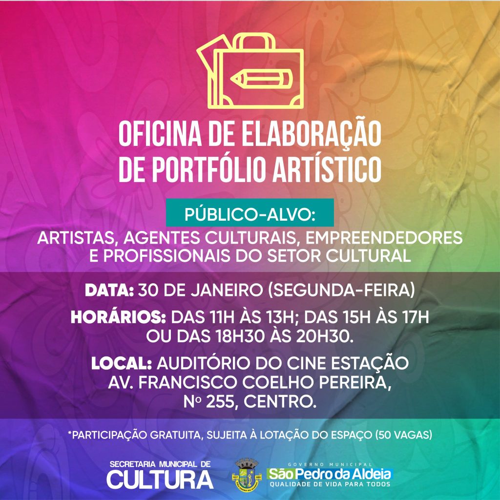 A Secretaria de Cultura de São Pedro da Aldeia promove, nesta segunda-feira (30/01), uma oficina de elaboração de portfólio voltada a artistas, produtores, agentes culturais e empreendedores ligados à área artística. O objetivo é fornecer instruções para a montagem do documento, que reúne informações e ilustrações sobre a trajetória do profissional. A atividade é gratuita e acontecerá no auditório do Cine Estação, no Centro da cidade, com três sessões disponíveis: das 11h às 13h; das 15h às 17h ou das 18h30 às 20h30.