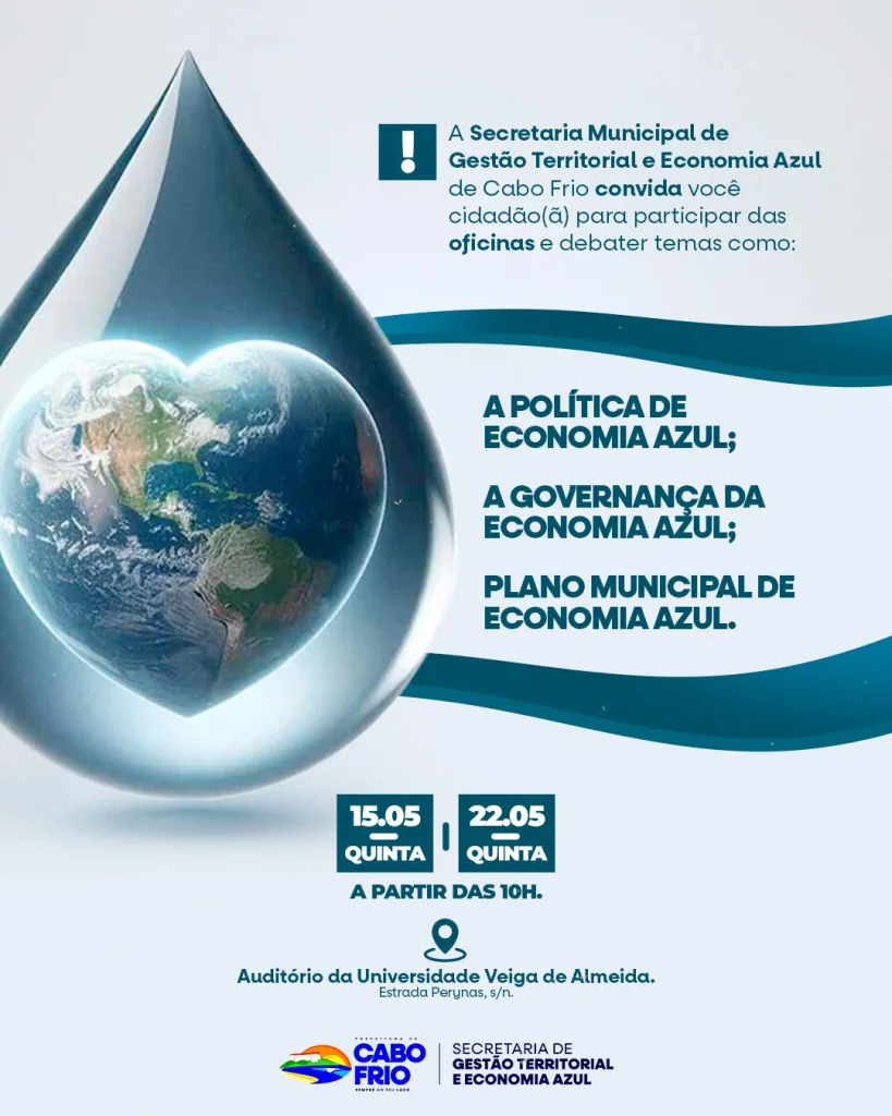 A Prefeitura de Cabo Frio, por meio da Secretaria Municipal de Gestão Territorial e Economia Azul, vai realizar, nos dias 15/05 e 22/05, às 10h, no auditório da Universidade Veiga de Almeida, oficinas para debater a Política de Economia Azul, a Governança da Economia Azul e o Plano Municipal de Economia Azul. O evento será aberto ao público, e a participação popular é fundamental para que sugestões sobre o tema sejam ouvidas e analisadas pela gestão do município.