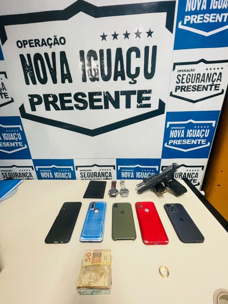 Agentes da Operação Nova Iguaçu Presente prenderam, nesta terça-feira (28/02), três homens que assaltaram um escritório de advocacia na Rua Dom Walmor, no Centro do município. Foram recuperados cinco aparelhos celulares, dois relógios, uma aliança de ouro e R$ 2.638,00 em espécie. Uma pistola calibre 9mm foi apreendida.