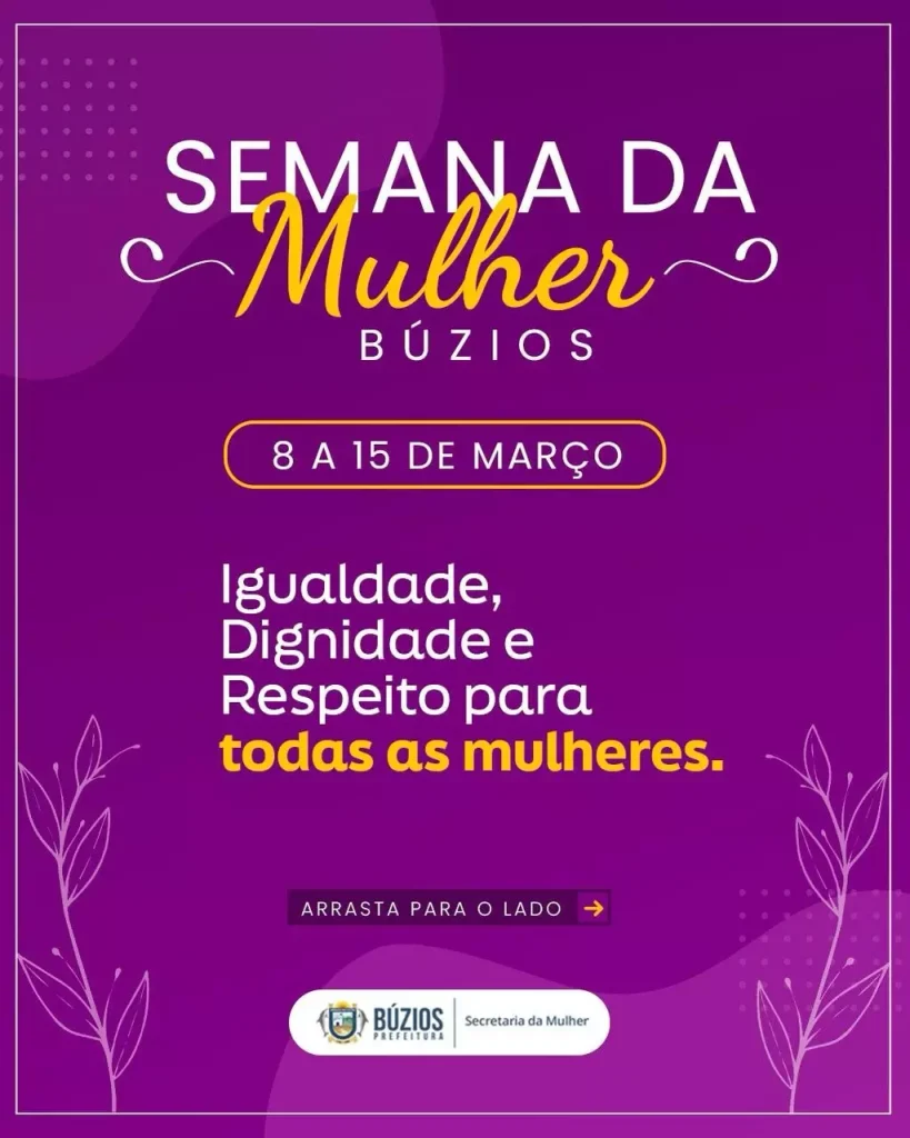 Em comemoração ao Dia Internacional da Mulher, que ocorrerá neste sábado (08), a Prefeitura de Búzios, através da Secretaria da Mulher, convida toda a comunidade para participar da Semana da Mulher, uma programação especial dedicada ao empoderamento, à cultura e à promoção da igualdade de gênero. Esta semana visa celebrar a força, a coragem e as conquistas das mulheres, além de refletir sobre os desafios e as oportunidades no caminho da independência feminina.