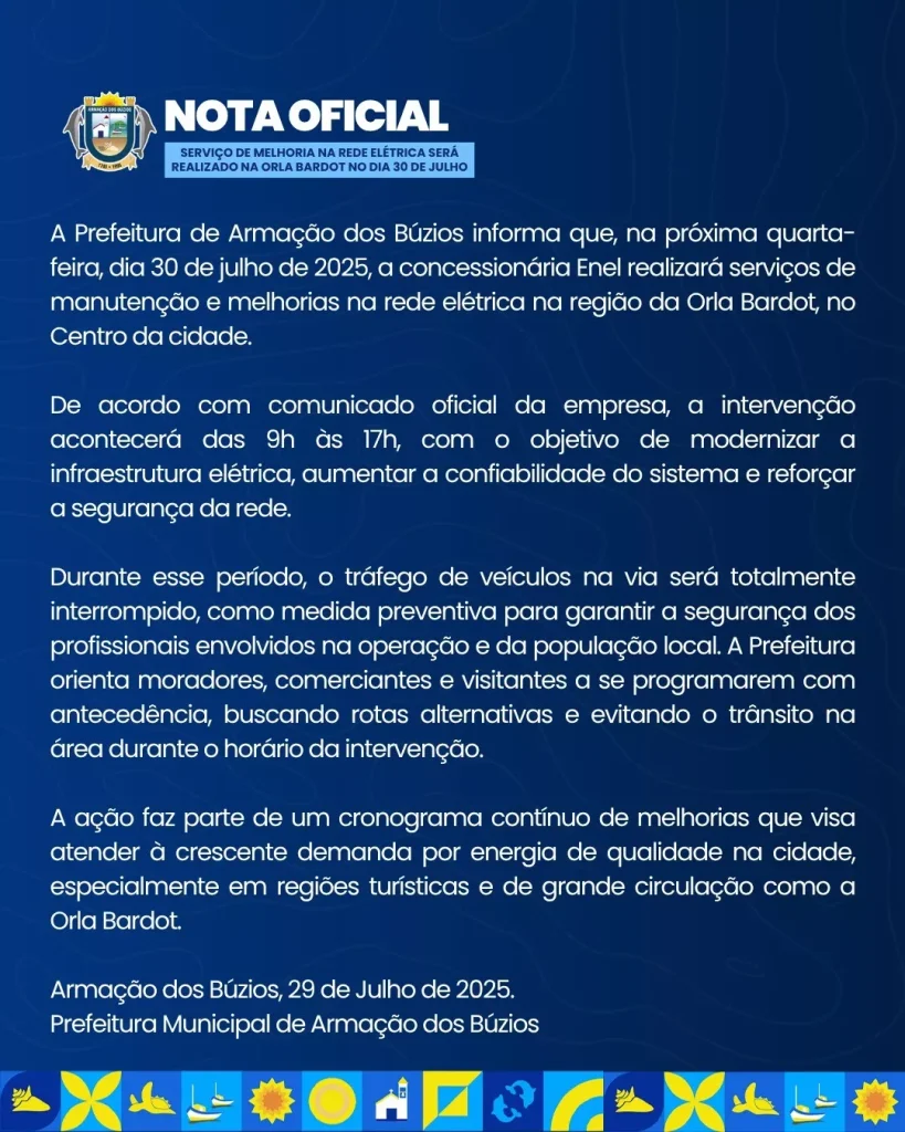 A Prefeitura de Armação dos Búzios informa que, nesta quarta-feira (30), a concessionária Enel realizará serviços de manutenção e melhorias na rede elétrica na região da Orla Bardot, no Centro da cidade.