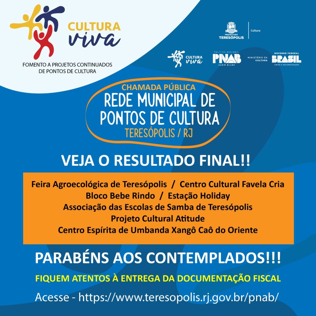Sete instituições e coletivos culturais foram aprovados: Feira Agroecológica de Teresópolis, Centro Cultural Favela Cria, Bloco Bebe Rindo, Estação Holiday, Associação das Escolas de Samba de Teresópolis (AEST), Projeto Cultural Atitude e o Centro Espírita de Umbanda Xangô Caô do Oriente.