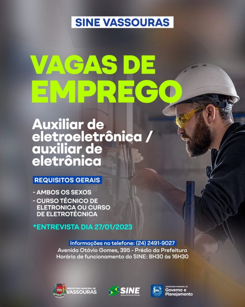 E exigido Curso Técnico de Eletrônica ou Curso de Eletrotécnica. A entrevista para vaga de emprego será nesta sexta-feira (27), no SINE, na Avenida Otávio Gomes, 395 – Prédio da Prefeitura.