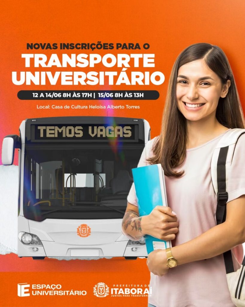 Chegou a hora dos estudantes, que precisam se locomover para outras cidades, garantirem suas vagas para o Transporte Universitário, oferecido pela Prefeitura de Itaboraí. As inscrições começam na próxima quarta-feira (12/06) e vão até o sábado (15/06), em modo presencial na Casa de Cultura Heloísa Alberto Torres, no Centro, de 8h às 17h e no sábado de 8h às 13h. Vale destacar que atualmente o Transporte Universitário atende alunos que estudam nos municípios de São Gonçalo e Niterói e opera em três turnos: manhã, tarde e noite.