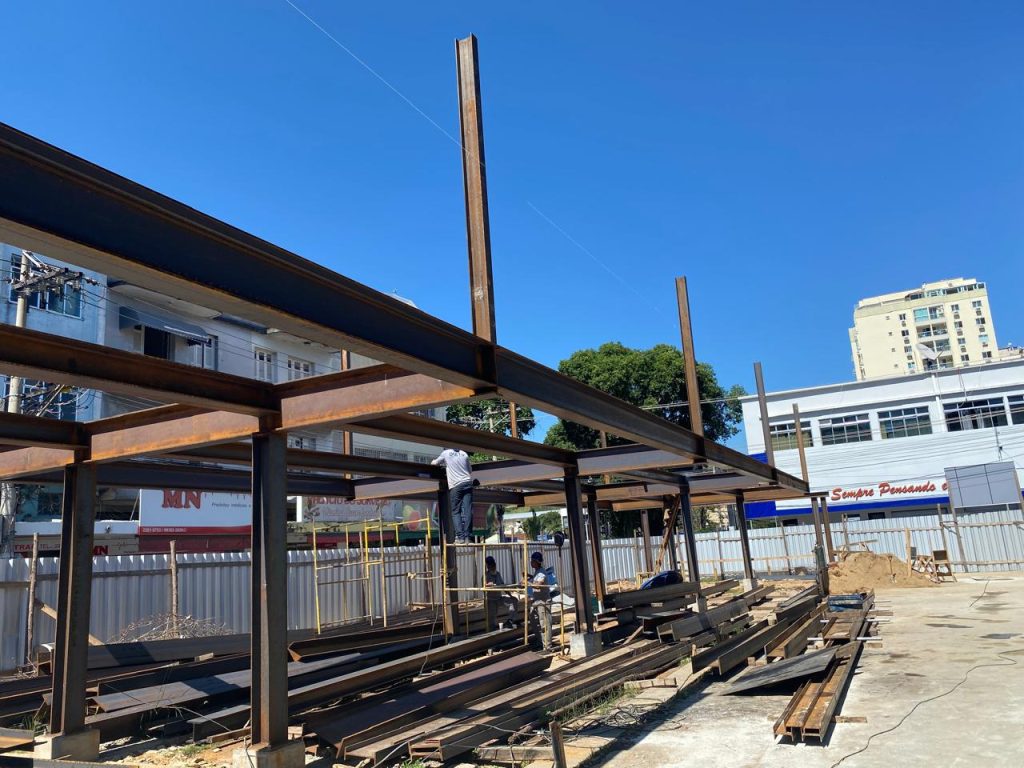 Já onde está sendo construído o novo edifício, estão sendo instalados os perfis metálicos que compõem a parte estrutural da construção, usados em substituição das vigas e dos pilares de sustentação convencionais. Os próximos passos são a criação da infraestrutura elétrica e hidrossanitária, o levantamento da parte de alvenaria dos quiosques e a montagem da torre técnica para o reservatório superior de água e a condensadora de ar condicionado.