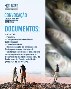 A Prefeitura de Armação dos Búzios, por meio de Secretaria de Pesca, informa que esta é a última semana para o cadastramento do Auxílio Defeso da Sardinha, benefício destinado aos pescadores artesanais do município. O cadastramento permanecerá aberto até o dia 17 de outubro, com atendimento realizado das 09h às 16h na Sede da Secretaria no Centro de Búzios.